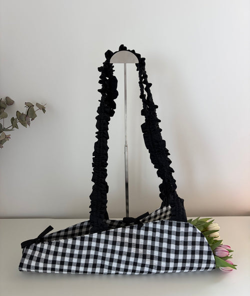 The CARMELA Bouquet Bag is crafted from the same soft polycotton fabric as the VERA, but with its own distinct design pattern and two features that set it apart: adjustable side panels for a custom fit, and a crossbody strap so your hands stay free while your flowers travel in style.